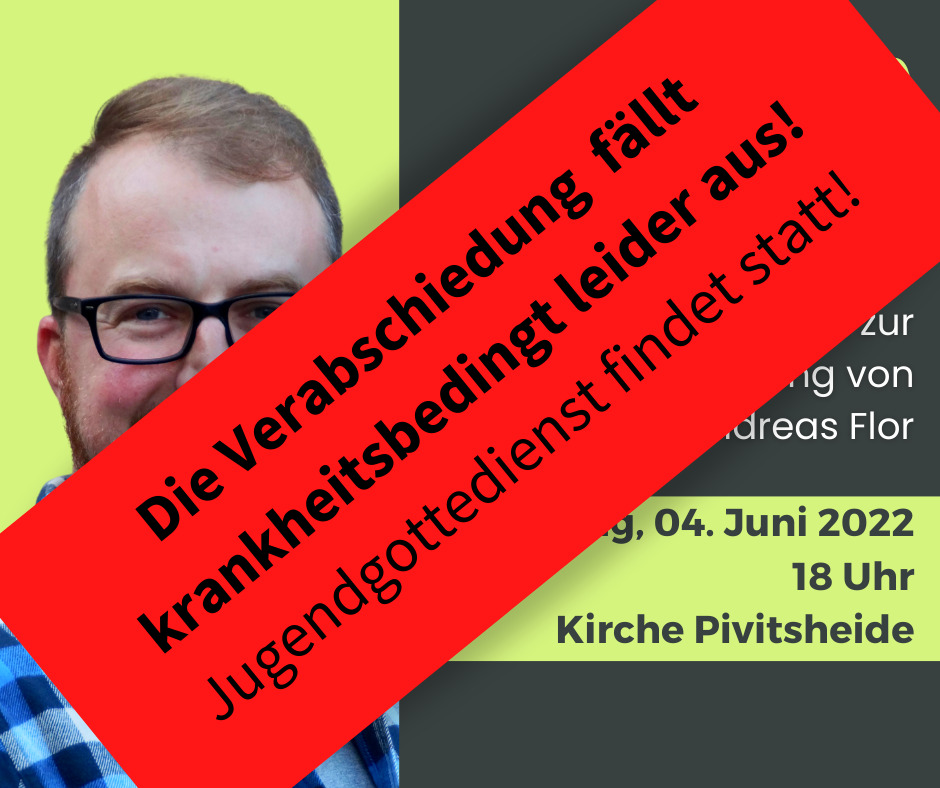 Leider muss die geplante Verabschiedung von Andreas Flor als Pfarrer unserer Gemeinde am Samstag, 04. Juni 2022 krankheitsbedingt ausfallen. Wir werden die Verabschiedung zu einem späteren Zeitpunkt nachholen.Der Jugendgottesdienst findet aber wie geplant am 4. Juni um 18 Uhr statt.