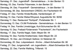Die kleine Adventsfeier beginnt jeweils um 19:00 Uhr und findet in der Regel draußen (z. B. im Garten, auf Terrasse, unter dem Carport oder in der Garage) statt. Die Treffen dauern maximal eine Stunde und beginnen mit einem adventlichen Impuls. Damit es nicht zu kalt wird, gibt es ein warmes Getränk; bitte bringen Sie sich eine Tasse mit. Wir freuen uns auf schöne Begegnungen und eine besinnliche Zeit mit Ihnen und Ihren Familien.